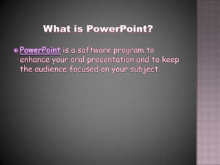 The document discusses file formats that can be used for movies in PowerPoint presentations. It notes that Macintosh prefers Quicktime movie formats (.mov) while Windows uses Windows Media files (.wmv). MPEG files can play on both platforms. Microsoft developed WMV and AVI specifically for Windows, while MPEG is an open standard developed to allow for compressed video formats. PowerPoint can play MPG, MPEG, WMV and AVI files as well as ASF files, an open source format. The document provides tips for font usage in PowerPoint, recommending using high contrast, common fonts, consistency, serif fonts for more text, avoiding all caps and script fonts.