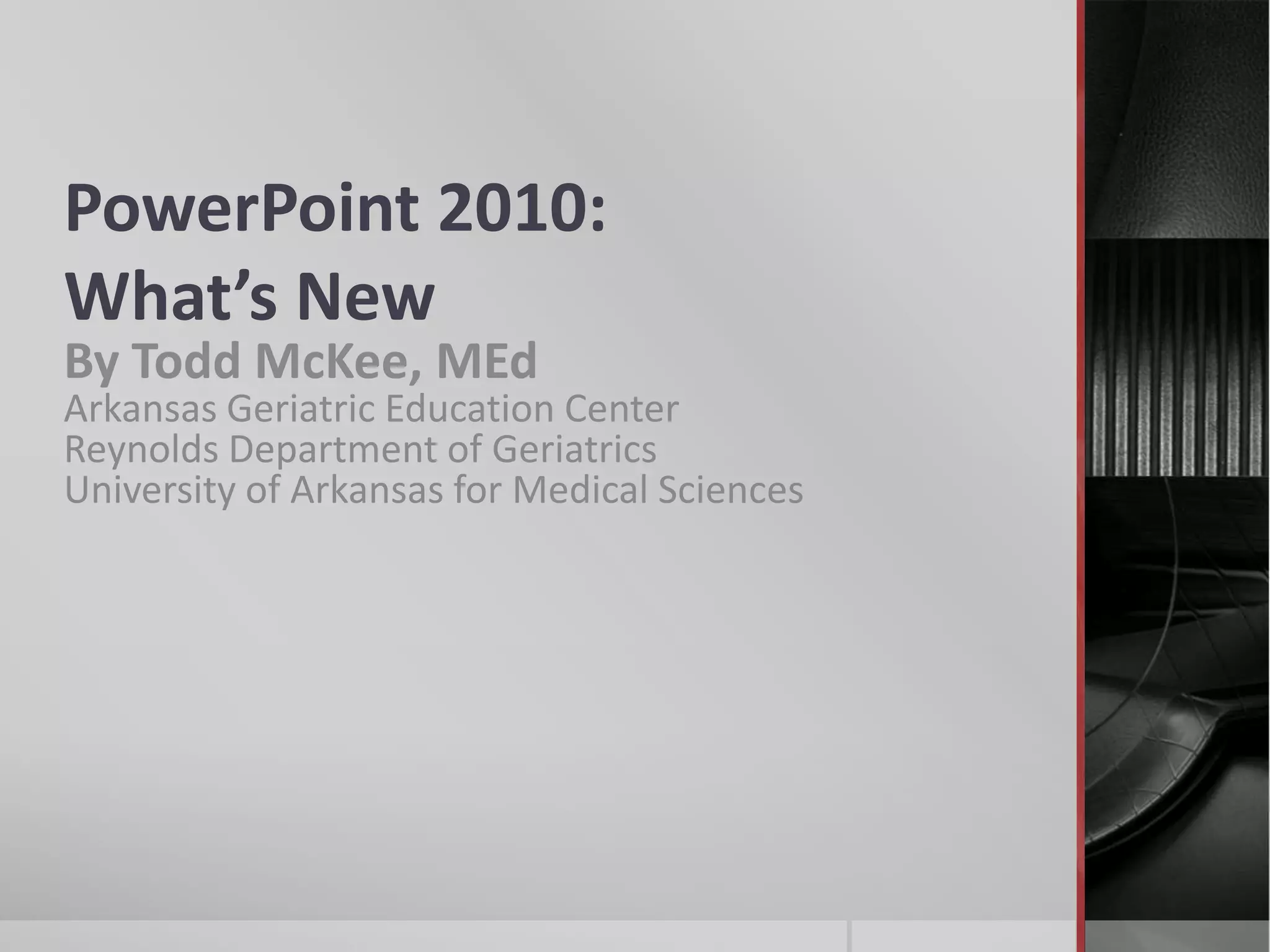 PowerPoint 2010 introduced many new features focused on video, including the ability to embed and edit video directly in PowerPoint. It also improved existing features like transitions, animations, and the equation editor. Sections and the screen capture tool were added to help organize slides and capture screenshots. The ribbon interface and broadcast slide show feature were enhanced to make presentations more dynamic and allow sharing with viewers online.