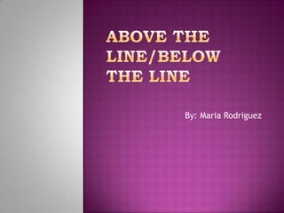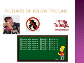 This document discusses the differences between being "above the line" and "below the line" and their potential consequences. Being above the line means making good decisions, setting goals, being respectful and caring for others. Being below the line involves hanging out with bad influences, illegal activities, disrespecting parents and making decisions that will have negative long-term effects like inability to graduate high school or succeed in life. The author believes being above the line leads to trust, success and helping others, while being below the line brings regret and lost opportunities.