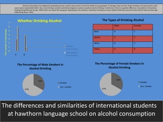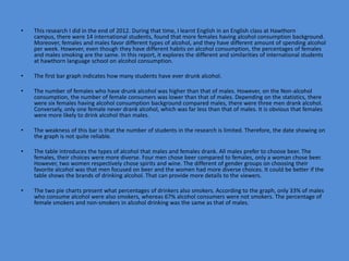 This document analyzes data from a study of 14 international students at Hawthorn Language School regarding their alcohol consumption habits. It found that more female students had experience drinking alcohol compared to male students. It also found that males primarily drank beer while females had more diverse drinking preferences, including beer, spirits, and wine. Additionally, the percentage of drinkers who also smoked was the same between genders, with 33% of both male and female drinkers being smokers.