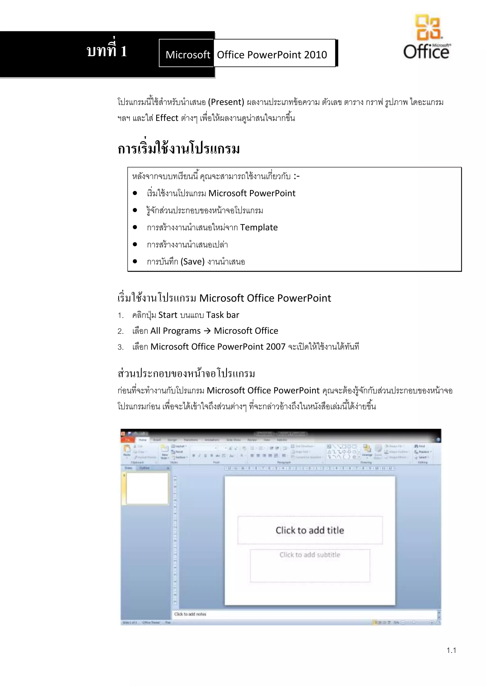 ตัวเลข ตาราง กราฟ รูปภาพ ไดอะแกรม ฯลฯ และใส่ Effect ต่างๆ เพื่อให้ผลงานดูน่าสนใจมากขึ้น การเริ่มใช้งานโปรแกรม หลังจากจบบทเรียนนี้คุณจะสามารถใช้งานเกี่ยวกับ :- เริ่มใช้งานโปรแกรม Microsoft PowerPoint รู้จักส่วนประกอบของหน้าจอโปรแกรม การสร้างงานนาเสนอใหม่จาก Template การสร้างงานนาเสนอเปล่า การบันทึก (Save) งานนาเสนอ เริ่มใช้งานโปรแกรม Microsoft Office PowerPoint 1. คลิกปุ่ม Start บนแถบ Task bar 2. เลือก All Programs Microsoft Office 3. เลือก Microsoft Office PowerPoint 2007 จะเปิดให้ใช้งานได้ทันที ส่วนประกอบของหน้าจอโปรแกรม ก่อนที่จะทางานกับโปรแกรม Microsoft Office PowerPoint คุณจะต้องรู้จักกับส่วนประกอบของหน้าจอ โปรแกรมก่อน เพื่อจะได้เข้าใจถึงส่วนต่างๆ ที่จะกล่าวอ้างถึงในหนังสือเล่มนี้ได้ง่ายขึ้น บทที่ 1 Microsoft Office Word 2007Office PowerPoint 2010