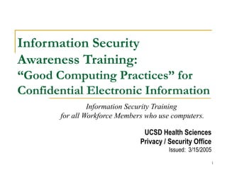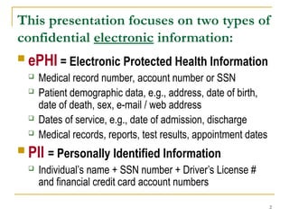 This document provides information security awareness training focused on protecting confidential electronic information, specifically electronic protected health information (ePHI) and personally identifiable information (PII). It outlines good computing practices, federal security rule requirements, and consequences of security violations for individuals who handle such data, emphasizing the importance of user responsibility and adherence to security protocols. The document lists various safeguards and standards for ensuring the confidentiality, integrity, and availability of sensitive information.