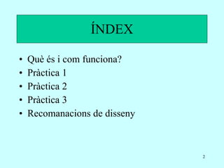 ÍNDEX Què ési com funciona? Pràctica 1 Pràctica 2 Pràctica 3 Recomanacions de disseny