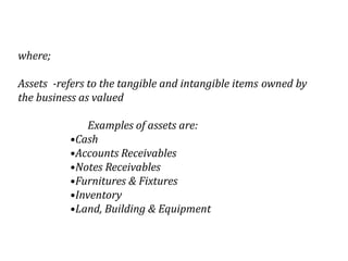 The document provides an overview of basic accounting concepts and procedures. It explains that accounting involves recording business transactions, adjusting account balances, and preparing financial statements. Key steps include journalizing transactions, posting to ledger accounts, taking a trial balance, compiling adjustment data, preparing a worksheet, making adjustments, and generating financial statements. The accounting equation, types of accounts, debit/credit rules, and accounting cycle are also outlined.