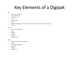 DigiPaks are a type of CD packaging made from cardstock or heavy paper that can fold open like a book. They typically contain the CD in a plastic tray attached to the paper packaging. Digipaks were created by MeadWestvaco to provide more design flexibility than traditional jewel cases. While aesthetically appealing, digipaks are more prone to damage over time as the paper materials can rip and the plastic trays are more likely to break than the hard plastic of jewel cases. The front cover must be eye-catching to attract buyers' attention and promote the artist.