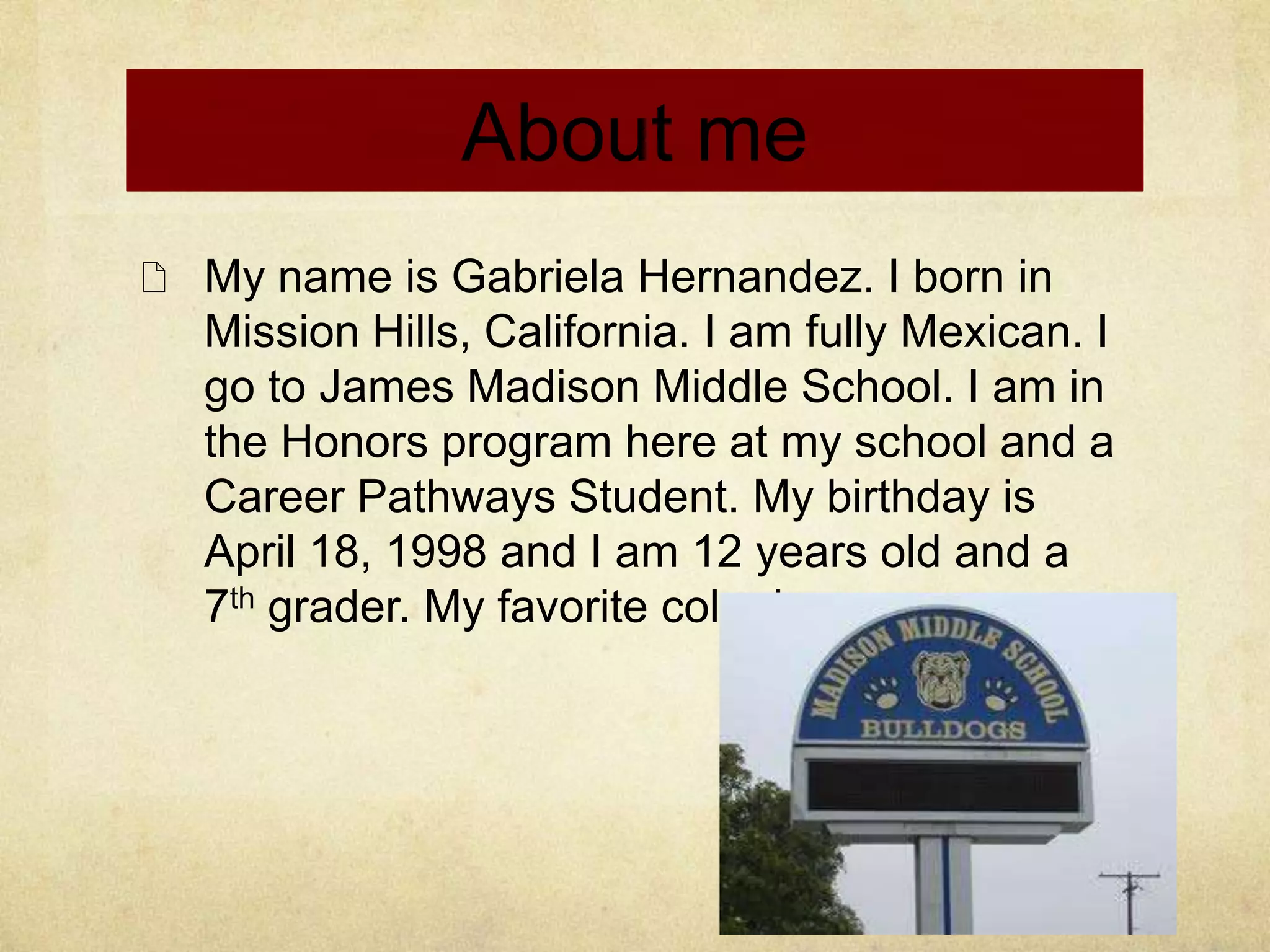 Gabriela Hernandez was born in Mission Hills, California. She is 12 years old and in the 7th grade at James Madison Middle School, where she is in the Honors program. Some of her hobbies include hanging out with friends, watching movies, going new places, playing sports, and listening to music. While she is still deciding on a career, she thinks she may pursue something in the arts field. Her top college choice is the University of California, San Diego due to its distance from home and beautiful campus.