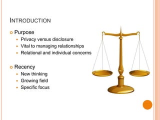 This document discusses Communication Privacy Management Theory, which focuses on how people manage private information and disclosure in relationships. It provides an overview of the theory's evolution over time from focusing on married couples to broader groups. It outlines assumptions of the theory, such as that people make choices and rules about disclosure based on themselves and others. The document also discusses critiques of the theory and provides a personal example of feeling a loss of control over private information.