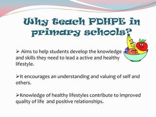 PDHPE (Personal Development, Health and Physical Education) aims to help primary school students develop knowledge and skills for a healthy, active lifestyle through physical education, personal development, and health content. Students learn skills like problem solving, moving, communicating, decision making, and interacting. They study invasion games, dancing, and components of an active lifestyle in PE, and topics like growth, safety, health choices, and relationships in PDH. The benefits of PDHPE include teamwork, fun, information, and cool games.
