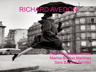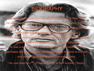 Richard Avedon was an American fashion photographer and portraitist born in New York City in 1923. He is known for his simple yet deeply psychological portraits of famous and unknown people against a plain white background. Avedon documented American culture and society in the second half of the 20th century through his photographs of notable figures that helped shape their time. He passed away in 2004 in San Antonio, Texas.
