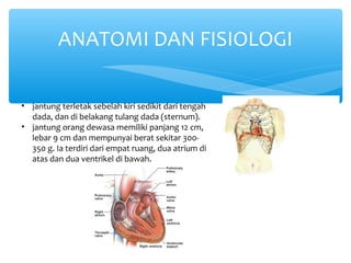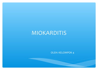 Dokumen ini membahas miokarditis, yaitu peradangan pada otot jantung (miokardium) yang dapat disebabkan oleh infeksi, reaksi alergi, atau toksin. Penyakit ini memiliki gejala dan tanda tertentu yang terkait dengan gangguan pernapasan, sirkulasi, dan perfusi jaringan. Selain itu, dokumen ini mencakup analisis data, diagnosis, dan intervensi keperawatan yang diperlukan untuk mengelola kondisi ini.