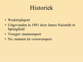 Historiek Vroeger zowelbinnen als buitensport Buiten: asfalt Binnen: hardhout of kunstof Officiële regels opgesteld door FIBA NBA heeft hier grote invloed op