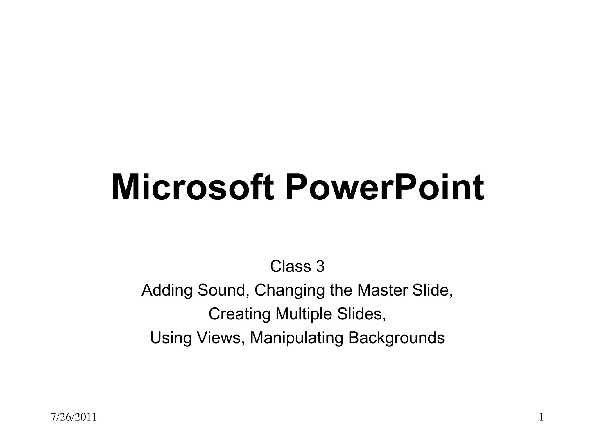This document provides instructions for various features in Microsoft PowerPoint, including adding sound, changing the master slide, creating multiple slides, using different views, and manipulating backgrounds. It describes how to start PowerPoint, use the master slide to apply consistent formatting to all slides, add sound clips, create and reorder slides, view slides individually or in sorter view, and change backgrounds using colors, patterns, textures, or pictures. The instructions are broken into sections with numbered steps and include screenshots to illustrate the steps.