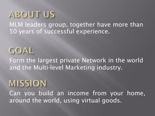 The document describes a multi-level marketing (MLM) compensation plan that allows individuals to build income from home using virtual goods across more than 50 countries. It outlines a new single queue system and a binary matrix system for recruitment and earnings, highlighting various cycle rewards and ranks based on participation. Registration is free, and participants can receive payouts via PayPal, further detailing the structure and potential earnings tiers.