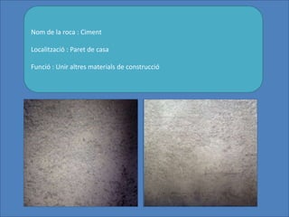 roca : Ciment Localització : Paret de casa Funció : Unir altres materials de construcció
