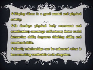 This document provides information about the history and rules of chess. It discusses how chess originated in India in the 15th century and was initially only played by royalty. It describes the standard Staunton chess piece designs used today. The document outlines some key events in chess history like the first international tournament in 1851 and the first official world championship in 1866. It also defines the movement rules for each chess piece: pawn, rook, knight, bishop, king, and queen. Finally, it assigns a homework activity for students to bring chess boards and answer a question about how playing chess can promote health and wellness.