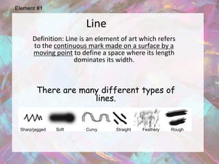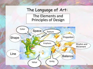 The document discusses the elements and principles of art and design. It defines line, shape, value, color, space, texture, balance, proportion, rhythm, movement, emphasis, unity, and variety. It provides examples of each element and principle, showing how artists use them, including works by Escher, Klee, Wyeth, Rivera, Van Eyck, Sharipo, and others. Composition is also discussed as the arrangement of elements in a work of art.