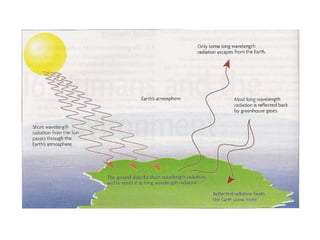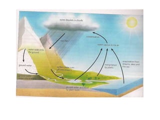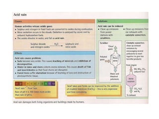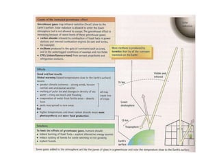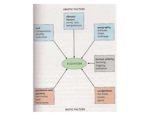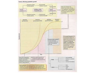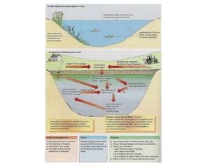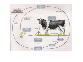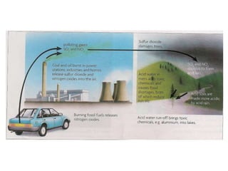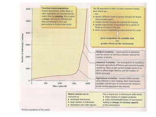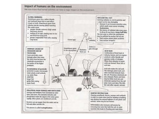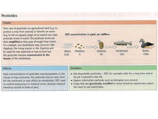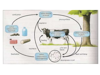 The document discusses several nutrient cycles (carbon, water, nitrogen) and how they interact with organisms and the environment. It then covers topics like the human population growth, human influences on ecosystems like agriculture, pollution, and conservation. Specific types of pollution are explained in more detail like water pollution from fertilizers and sewage, air pollution from sulfur dioxide and greenhouse gases, and nuclear fallout from accidents. Agriculture can impact ecosystems through deforestation and fertilizer use.