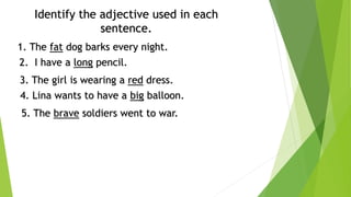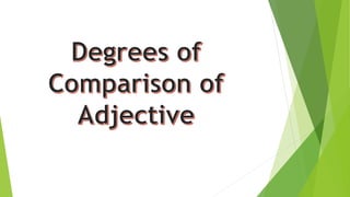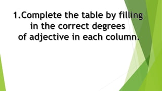 The document identifies the different degrees of adjectives (positive, comparative, superlative) and provides examples of how to use each degree when comparing one, two, or three or more objects or people. It also includes an exercise for students to identify the correct degree of adjective in sample sentences and arrange words to form sentences using comparative and superlative adjectives.