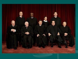 The document provides biographical information about current and past Supreme Court justices with different judicial philosophies. It also discusses the process for appointing judges and reviewing cases by the Supreme Court. The justices mentioned include Stephen Breyer, Samuel Alito, Sandra Day O'Connor, Ruth Bader Ginsburg, Antonin Scalia, Anthony Kennedy, and David Souter. Their judicial philosophies are identified as either conservative, liberal, or moderate. The appointment process and how the Supreme Court decides which cases to review is briefly outlined.