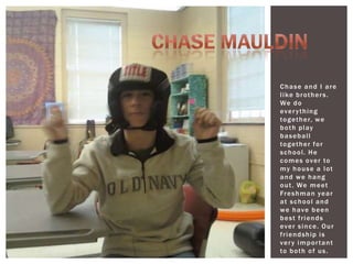 The document describes the author's close friendships with several people from school and childhood. It discusses how the author met Chase in 9th grade and they have been best friends since, playing baseball together. It also talks about meeting Pressley over the summer before 9th grade at church and how they have grown closer over the last year. The author notes being friends with Jordan since childhood and playing baseball together in high school. It briefly discusses being friends with Ham since 9th grade and Dalton since elementary school, though they do not hang out as much now. The author considers his uncle David, who is also 35 years old, as one of his best friends who has influenced his interest in law enforcement. It ends by saying Samanth