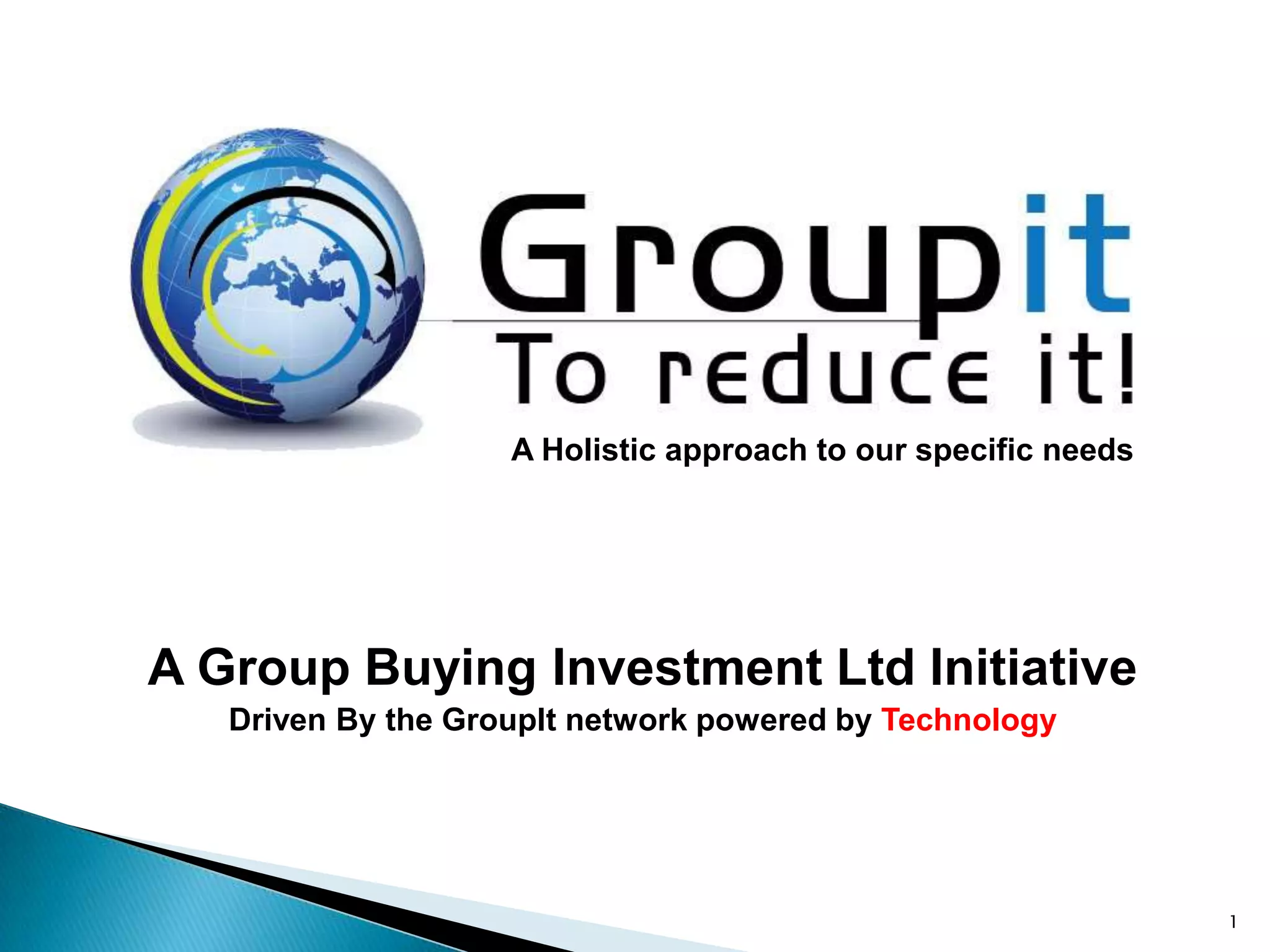 This document outlines a holistic approach for a group buying investment initiative called GroupIt. GroupIt allows people to unite and negotiate lower prices on goods and services. It works by amalgamating large groups of people to negotiate discounts with manufacturers and suppliers. Retailers are then given the opportunity to buy products at massive discounts from these suppliers. Finally, local GroupIt members can enjoy the discounted prices through participating retailers. The system creates a global campaign that results in local savings effects for consumers through bulk-negotiated price reductions.