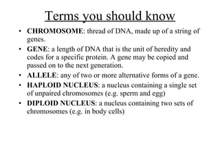 The document discusses basic concepts of heredity and genetics, including chromosomes, genes, alleles, dominance, and patterns of inheritance. It explains Mendel's experiments with pea plants and how they led to the concepts of dominant and recessive alleles. It also discusses sex determination, genetic disorders, and using Punnett squares and family trees to predict inheritance patterns.