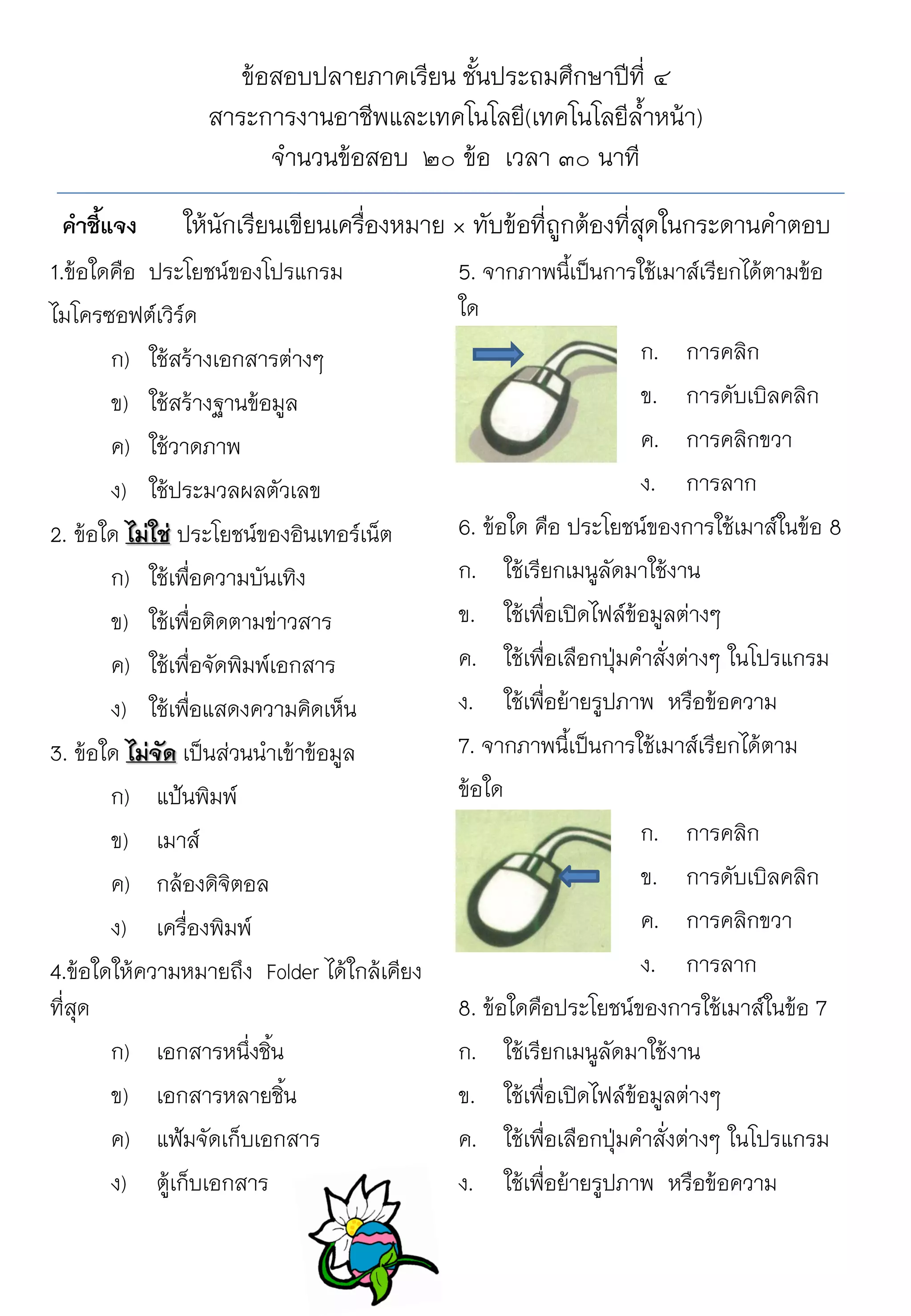 ๒๐ ข้อ เวลา ๓๐ นาที คำชี้แจง ให้นักเรียนเขียนเครื่องหมาย × ทับข้อที่ถูกต้องที่สุดในกระดานค้าตอบ 1.ข้อใดคือ ประโยชน์ของโปรแกรม ไมโครซอฟต์เวิร์ด ก) ใช้สร้างเอกสารต่างๆ ข) ใช้สร้างฐานข้อมูล ค) ใช้วาดภาพ ง) ใช้ประมวลผลตัวเลข 2. ข้อใด ไม่ใช่ ประโยชน์ของอินเทอร์เน็ต ก) ใช้เพื่อความบันเทิง ข) ใช้เพื่อติดตามข่าวสาร ค) ใช้เพื่อจัดพิมพ์เอกสาร ง) ใช้เพื่อแสดงความคิดเห็น 3. ข้อใด ไม่จัด เป็นส่วนน้าเข้าข้อมูล ก) แป้นพิมพ์ ข) เมาส์ ค) กล้องดิจตอล ิ ง) เครื่องพิมพ์ 4.ข้อใดให้ความหมายถึง Folder ได้ใกล้เคียง ที่สุด ก) เอกสารหนึ่งชิ้น ข) เอกสารหลายชิ้น ค) แฟ้มจัดเก็บเอกสาร ง) ตู้เก็บเอกสาร 5. จากภาพนีเป็นการใช้เมาส์เรียกได้ตามข้อ ้ ใด ก. การคลิก ข. การดับเบิลคลิก ค. การคลิกขวา ง. การลาก 6. ข้อใด คือ ประโยชน์ของการใช้เมาส์ในข้อ 8 ก. ใช้เรียกเมนูลัดมาใช้งาน ข. ใช้เพื่อเปิดไฟล์ข้อมูลต่างๆ ค. ใช้เพื่อเลือกปุ่มค้าสั่งต่างๆ ในโปรแกรม ง. ใช้เพื่อย้ายรูปภาพ หรือข้อความ 7. จากภาพนี้เป็นการใช้เมาส์เรียกได้ตาม ข้อใด ก. การคลิก ข. การดับเบิลคลิก ค. การคลิกขวา ง. การลาก 8. ข้อใดคือประโยชน์ของการใช้เมาส์ในข้อ 7 ก. ใช้เรียกเมนูลัดมาใช้งาน ข. ใช้เพื่อเปิดไฟล์ข้อมูลต่างๆ ค. ใช้เพื่อเลือกปุ่มค้าสั่งต่างๆ ในโปรแกรม ง. ใช้เพื่อย้ายรูปภาพ หรือข้อความ