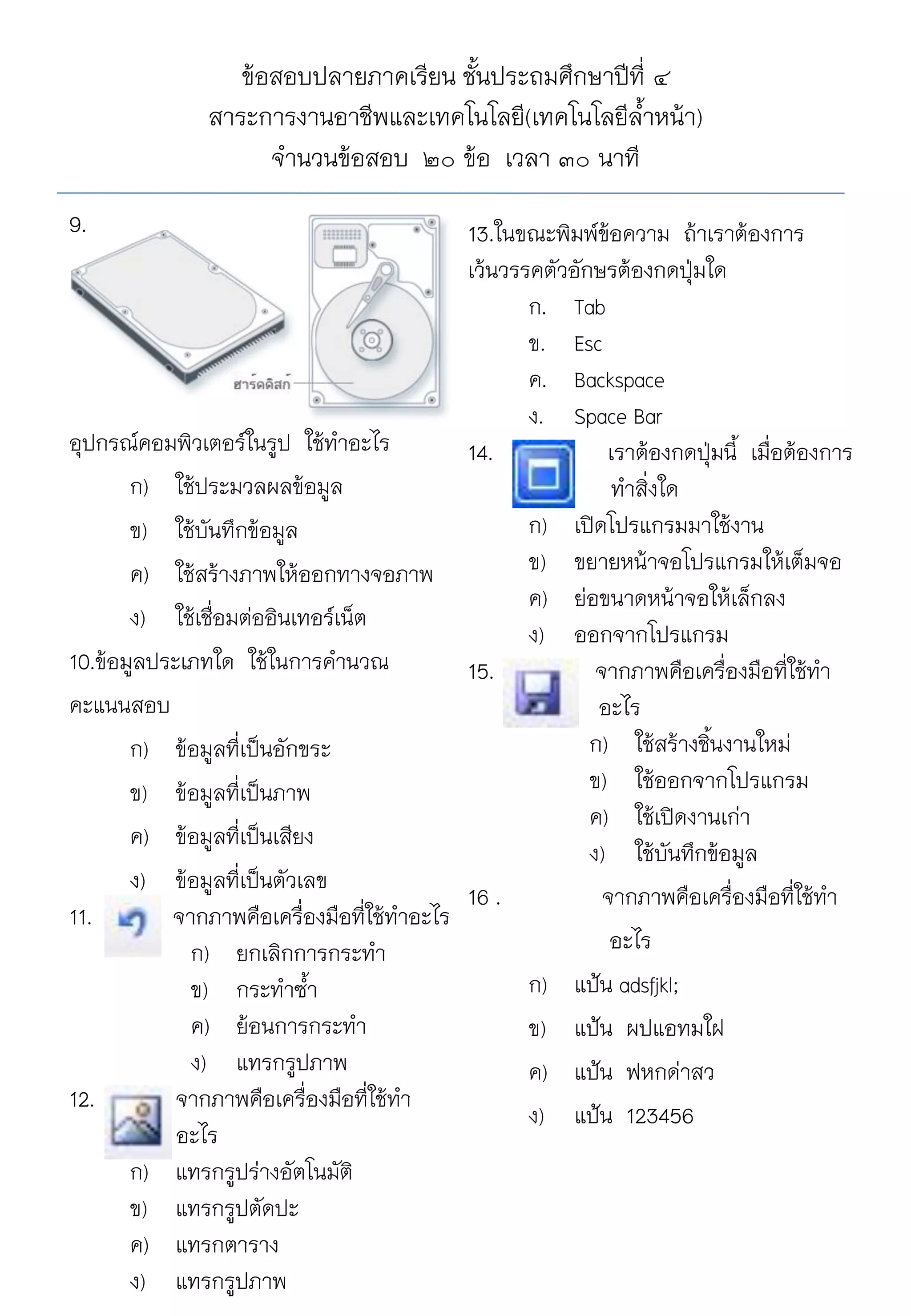 ๒๐ ข้อ เวลา ๓๐ นาที 9. 13.ในขณะพิมพ์ข้อความ ถ้าเราต้องการ เว้นวรรคตัวอักษรต้องกดปุ่มใด ก. Tab ข. Esc ค. Backspace ง. Space Bar อุปกรณ์คอมพิวเตอร์ในรูป ใช้ท้าอะไร 14. เราต้องกดปุ่มนี้ เมื่อต้องการ ก) ใช้ประมวลผลข้อมูล ท้าสิ่งใด ก) เปิดโปรแกรมมาใช้งาน ข) ใช้บันทึกข้อมูล ข) ขยายหน้าจอโปรแกรมให้เต็มจอ ค) ใช้สร้างภาพให้ออกทางจอภาพ ค) ย่อขนาดหน้าจอให้เล็กลง ง) ใช้เชื่อมต่ออินเทอร์เน็ต ง) ออกจากโปรแกรม 10.ข้อมูลประเภทใด ใช้ในการค้านวณ 15. จากภาพคือเครื่องมือที่ใช้ท้า คะแนนสอบ อะไร ก) ใช้สร้างชินงานใหม่ ้ ก) ข้อมูลที่เป็นอักขระ ข) ใช้ออกจากโปรแกรม ข) ข้อมูลที่เป็นภาพ ค) ใช้เปิดงานเก่า ค) ข้อมูลที่เป็นเสียง ง) ใช้บันทึกข้อมูล ง) ข้อมูลที่เป็นตัวเลข 16 . จากภาพคือเครื่องมือที่ใช้ท้า 11. จากภาพคือเครื่องมือที่ใช้ท้าอะไร อะไร ก) ยกเลิกการกระท้า ก) แป้น adsfjkl; ข) กระท้าซ้้า ค) ย้อนการกระท้า ข) แป้น ผปแอทมใฝ ง) แทรกรูปภาพ ค) แป้น ฟหกด่าสว 12. จากภาพคือเครื่องมือที่ใช้ท้า ง) แป้น 123456 อะไร ก) แทรกรูปร่างอัตโนมัติ ข) แทรกรูปตัดปะ ค) แทรกตาราง ง) แทรกรูปภาพ