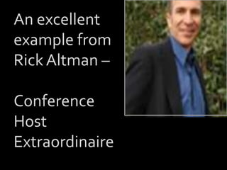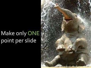 The document provides guidelines for creating more effective PowerPoint presentations. It warns that boring or overly wordy PowerPoint decks can cause "Death by PowerPoint". The guidelines include speaking at a slower pace than reading, ditching bullet points in favor of visual elements, spell checking for errors, using fewer animations and data points per slide, avoiding bad color schemes, and making sure each slide focuses on only one key point. Pictures and visuals are emphasized as aids for communication and keeping the audience engaged.