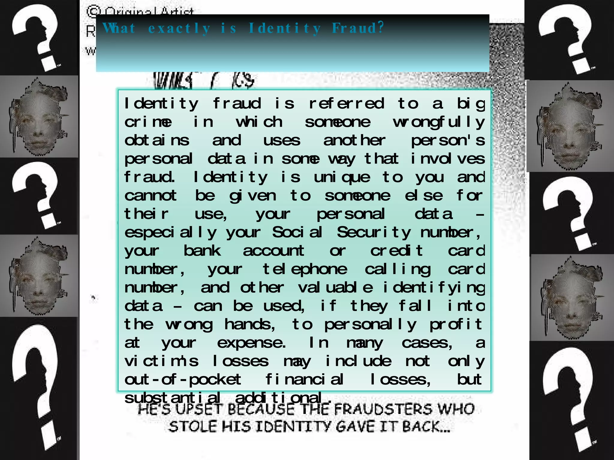 1. Identity fraud involves someone obtaining and using another person's personal data like their Social Security number, bank account information, or other identifying details without permission in order to steal money or commit other fraud.