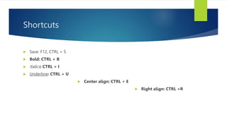 This document contains tips and shortcuts for using PowerPoint. It includes sections on shortcuts, editing text, working with graphics, tables, charts, morphing transitions between slides, and reviewing presentations. The tips are for formatting text, applying edits to images, copying colors between objects, grouping objects, enhancing slides with tables and charts, and using the morph transition to transition between arranged objects on successive slides. It also provides suggestions for saving, printing and converting presentations to PDF format.