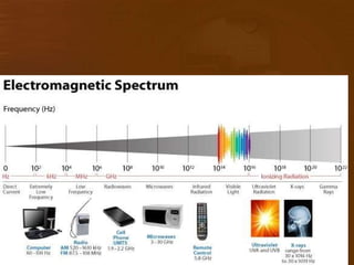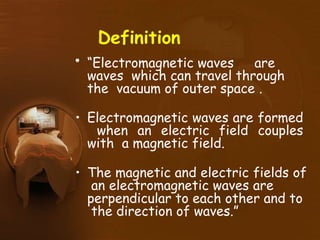 Electromagnetic waves are formed by the interaction of electric and magnetic fields and travel through a vacuum at the speed of light (300,000 km/sec). They encompass a spectrum of wave types including radio waves, microwaves, infrared, visible light, ultraviolet, x-rays, and gamma rays, each interacting with matter differently and having unique medical applications. Various medical uses of electromagnetic waves include imaging technologies such as MRI and x-rays, therapies like radiofrequency ablation and microwave treatments, and sterilization processes.