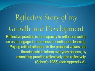 The document discusses reflective practice as the ability to reflect on one's actions to engage in continuous learning. It involves critically examining practice and theories through a reflective and reflexive lens. The portfolio reflects on the student's experiences in a course to develop as a self-empowered, lifelong learner and reflective practitioner.