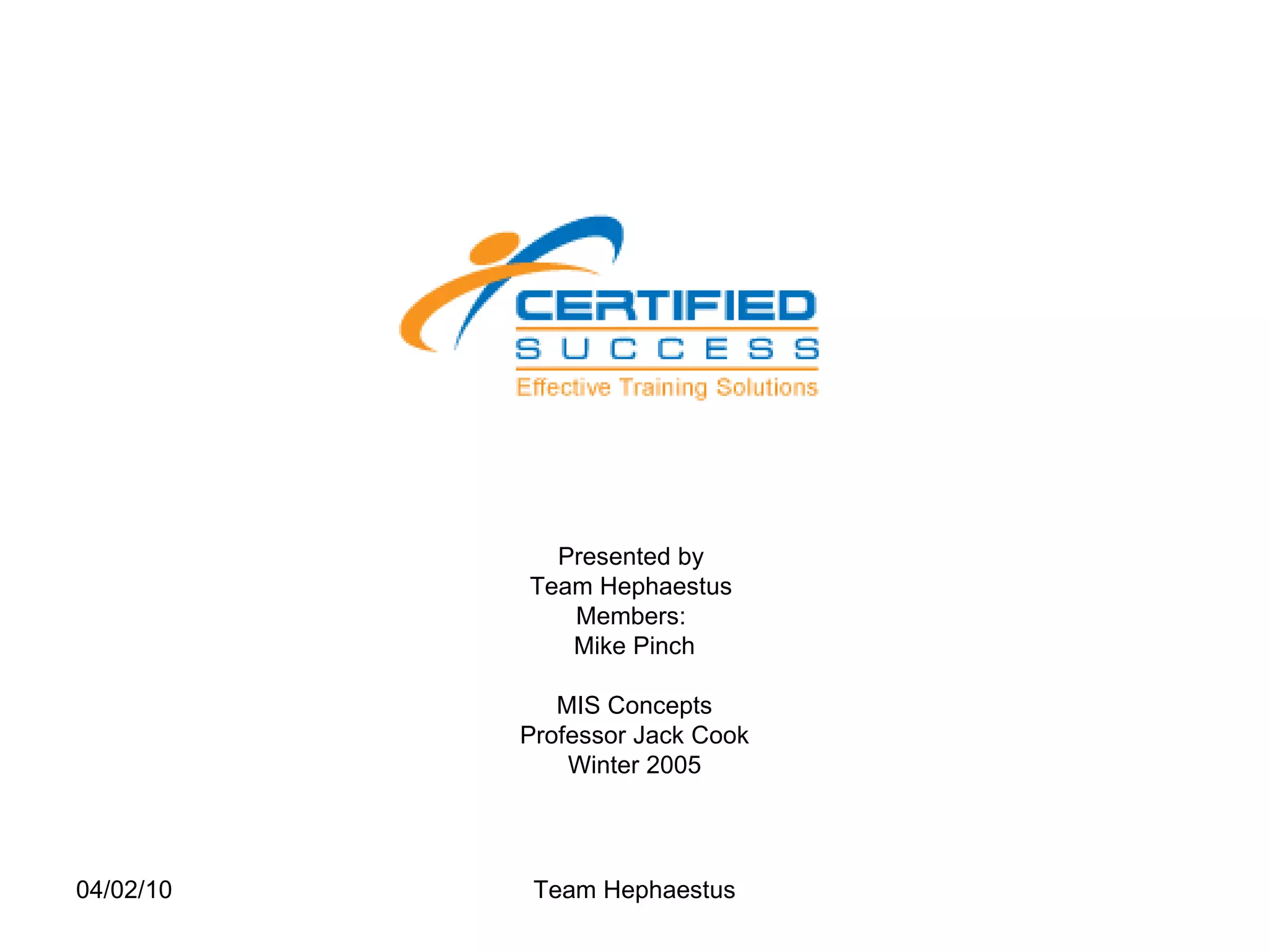 Certified Success is a new business venture that will offer consulting services and sell intellectual property through a website to help customers with training, certification, and learning for quality assurance and production management. The website will be developed using common web technologies and hosted affordably. The business aims to achieve profitability within two years by growing its customer base locally and expanding its certification offerings through new consultants. Projected annual earnings from the website are over $100,000 in the first year and over $300,000 in the second year.