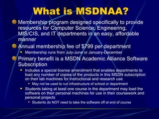 The MSDNAA program provides affordable software resources for academic departments, including operating systems, development tools, and server software. Key details: