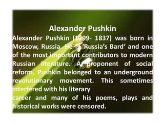 This 3 line summary captures the essential information from the poem "To My Nanny" by Alexander Pushkin: The poem is addressed to the poet's nanny who patiently waits alone by the window in a lone house in the wild forest for his return, knitting by the window but stopping frequently as she watches the road with nameless forebodings and dark anxieties, unable to discern what is causing her worry.