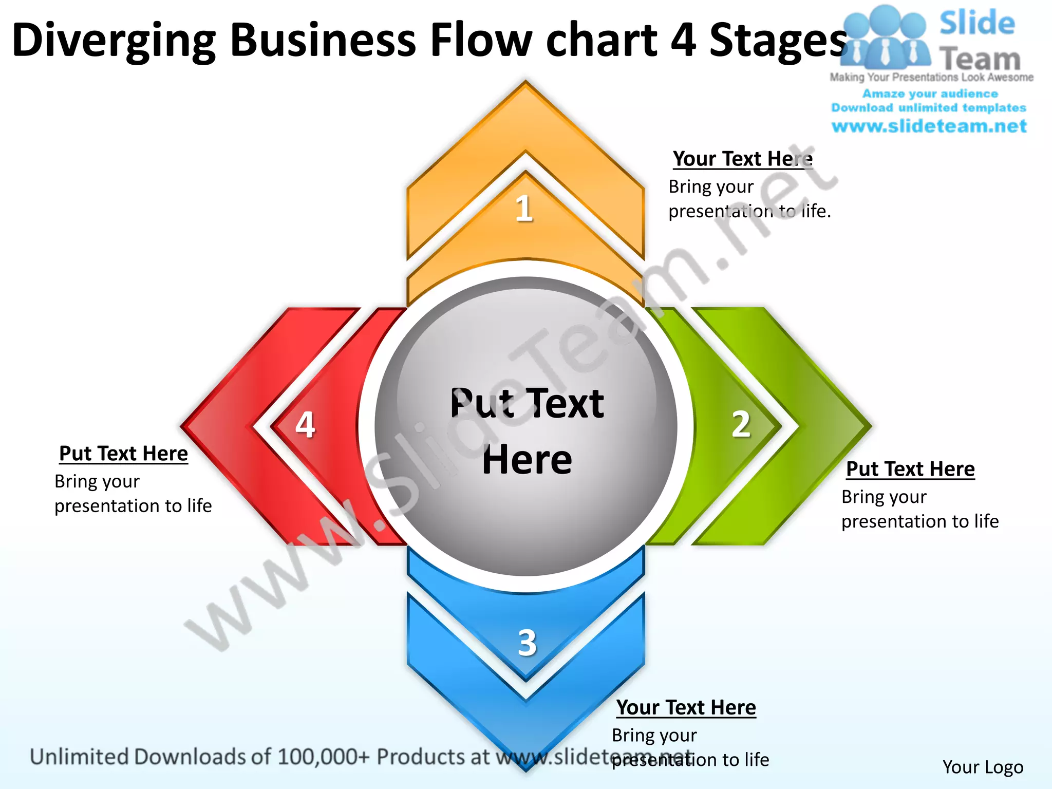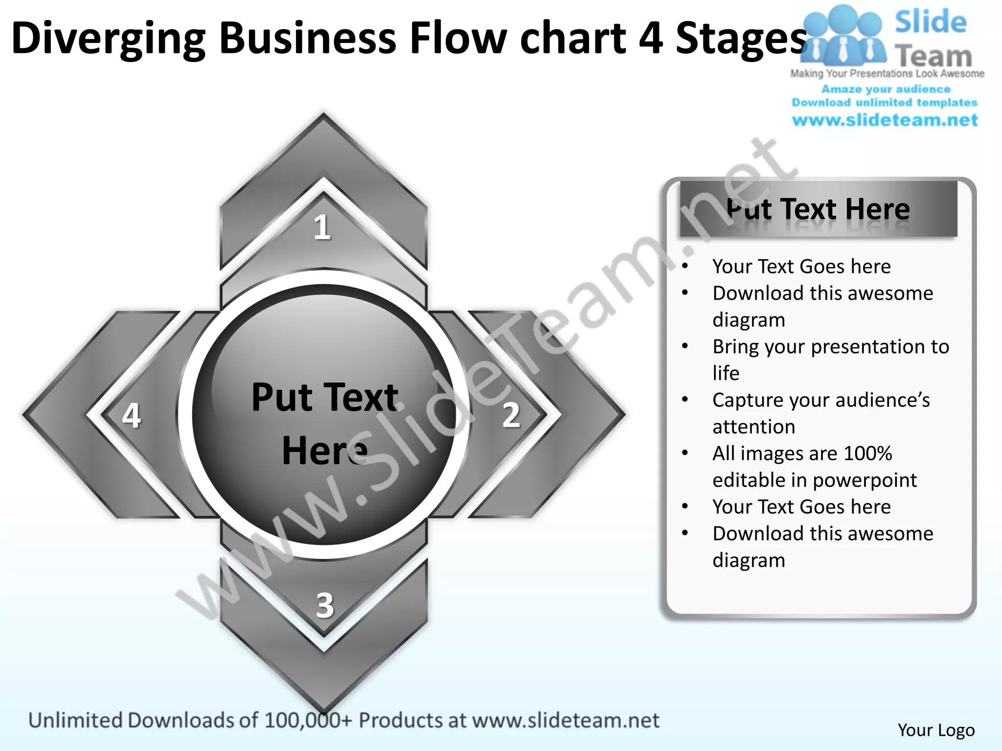 The document describes a diverging business flow chart template with 4 stages. The template includes editable shapes that can be customized. Users can ungroup objects, edit colors, and change size and orientation of icons. All images in the template are 100% editable in PowerPoint to customize the presentation.