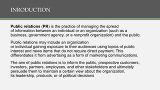 The document is a presentation on public relations (PR) that discusses its definition, importance, and ethical considerations. It explains PR as the management of information between organizations and the public, aiming to maintain a favorable image and establish long-term relationships. Additionally, it outlines the ethical guidelines for PR practitioners and offers do's and don'ts to ensure effective communication and reputation management.