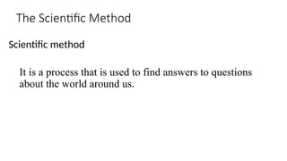 The document outlines the scientific method, emphasizing its use in investigating questions about the world, detailing the definition and types of variables involved in research, and explaining how to design and conduct clinical studies. It discusses independent and dependent variables, various scales of measurement, and the ethical considerations of clinical studies, including informed consent and the role of institutional review boards. Additionally, it covers methodologies for primary and secondary research methods, including exploratory approaches and data collection techniques to gather relevant information for research purposes.