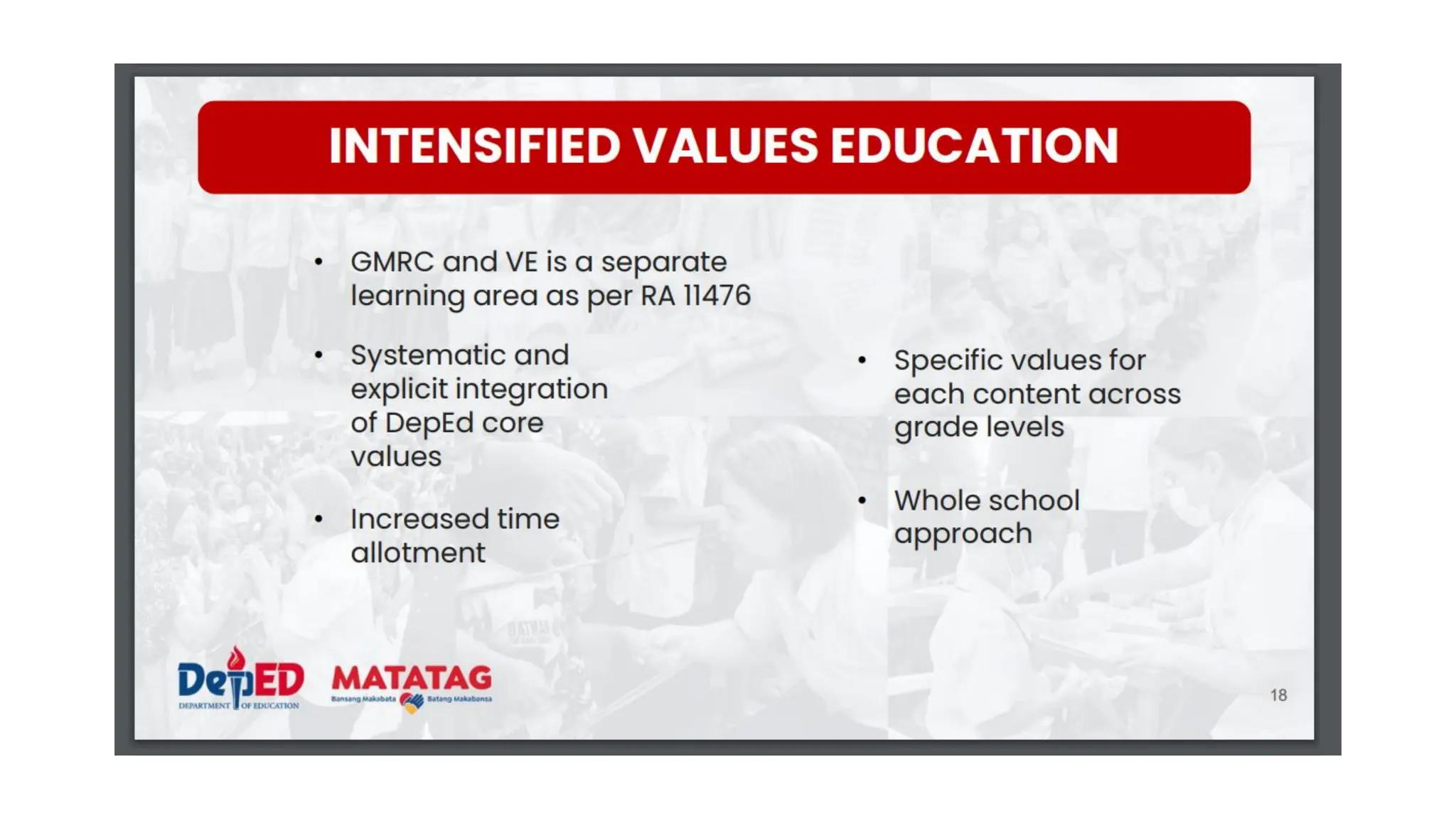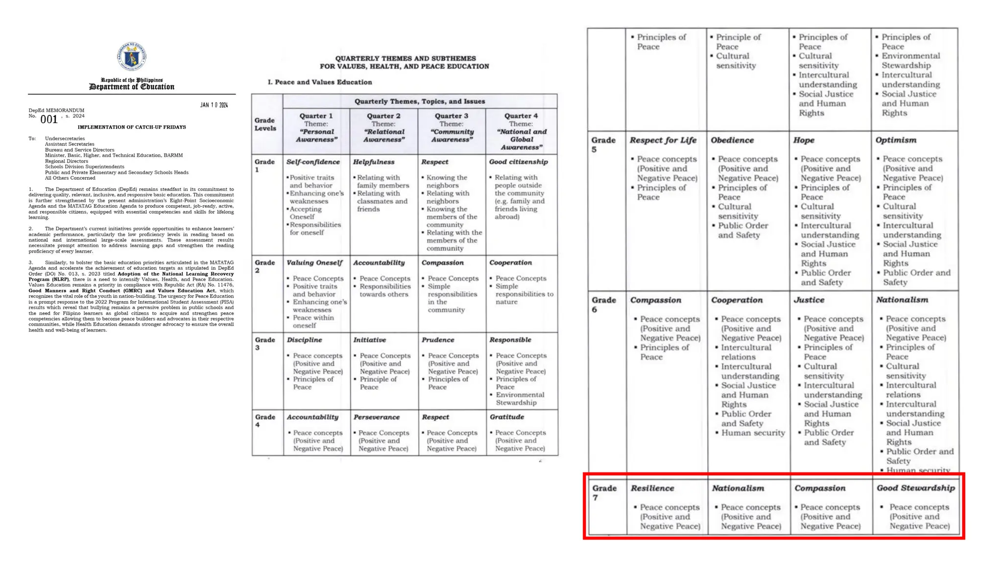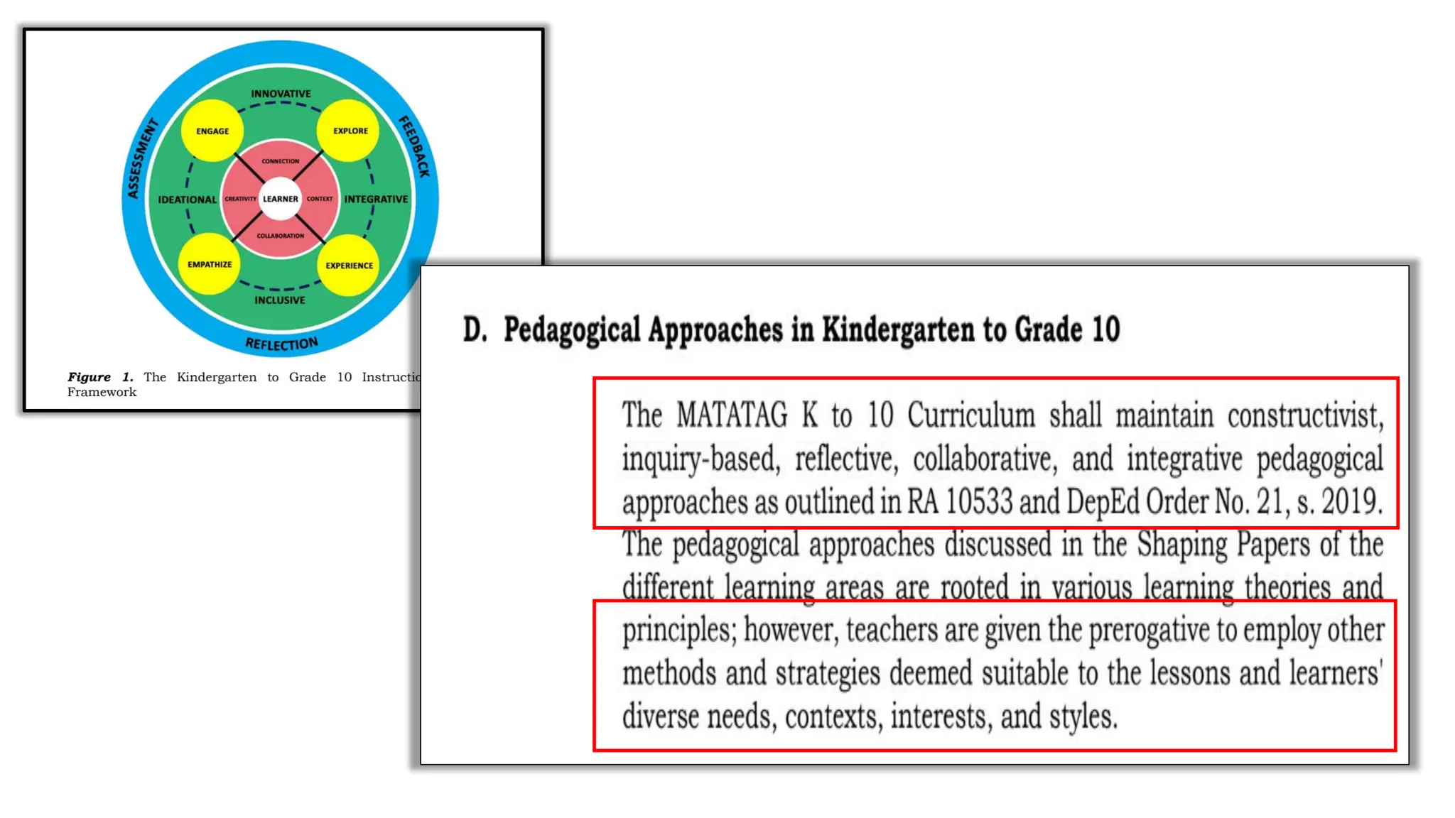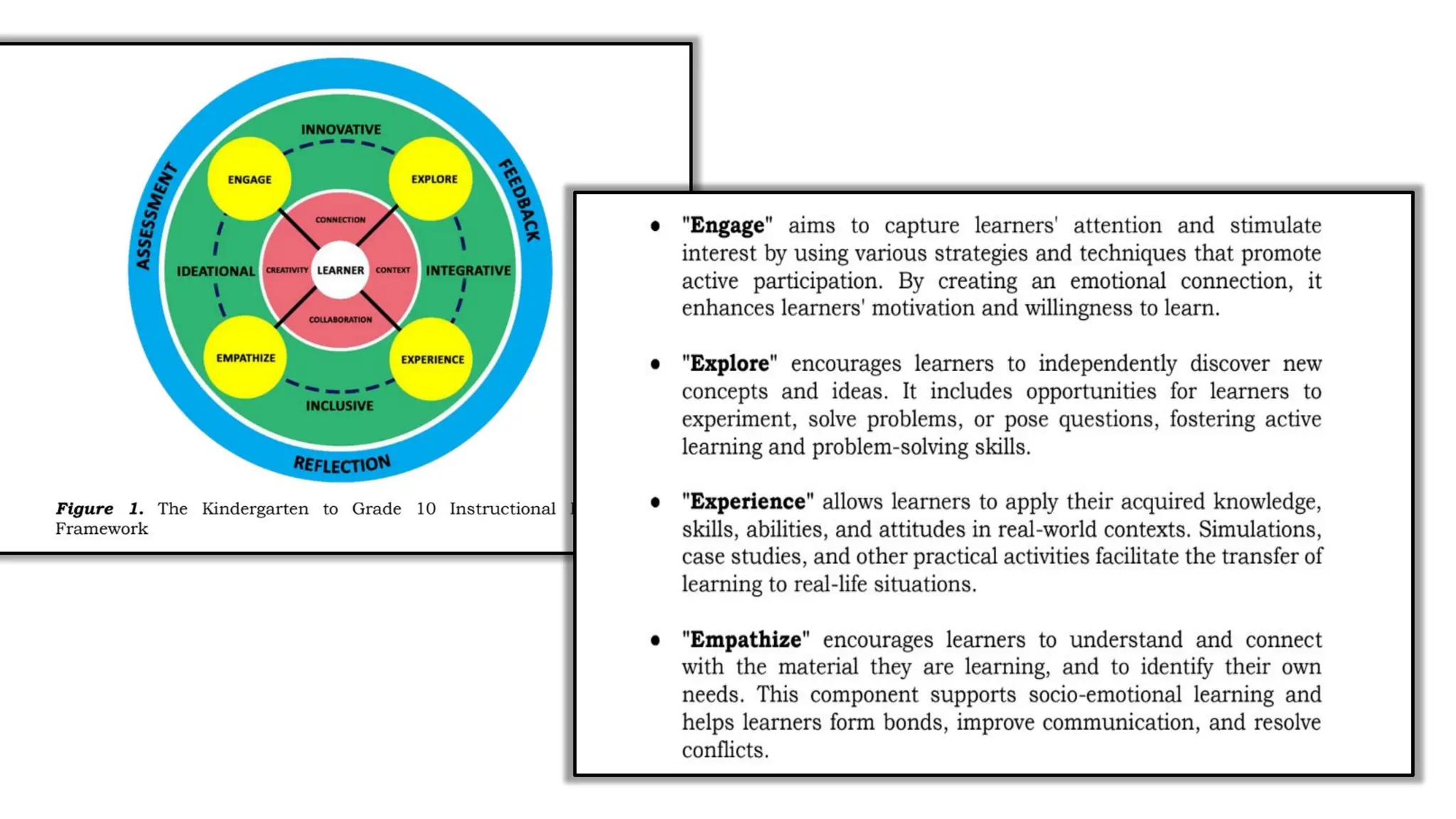 The document outlines the 4Es instructional design framework used in the Matatag curriculum, detailing processes like engaging, exploring, experiencing, and empathizing. It emphasizes the comparison of 4Es with other models such as the 5Es instructional model and discusses the integration of values education and peace education in lessons. Additionally, it provides guidelines for developing learning plans that meet PEAC certification criteria, incorporating essential questions and reflecting on student engagement and learning outcomes.