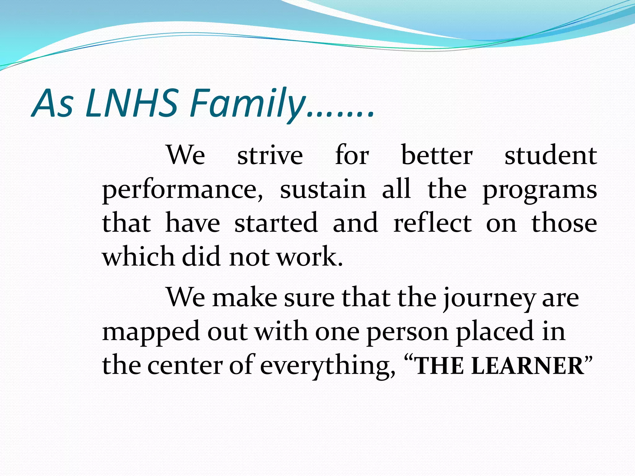 The document outlines guiding principles for a school to create and sustain high performance. It emphasizes placing students at the center and having a common mission, vision, and goals. It stresses the importance of collaboration between teachers, data-driven decision making, and engaging families and the community. The school aims to improve student performance, sustain effective programs, and reflect on programs that did not work well.