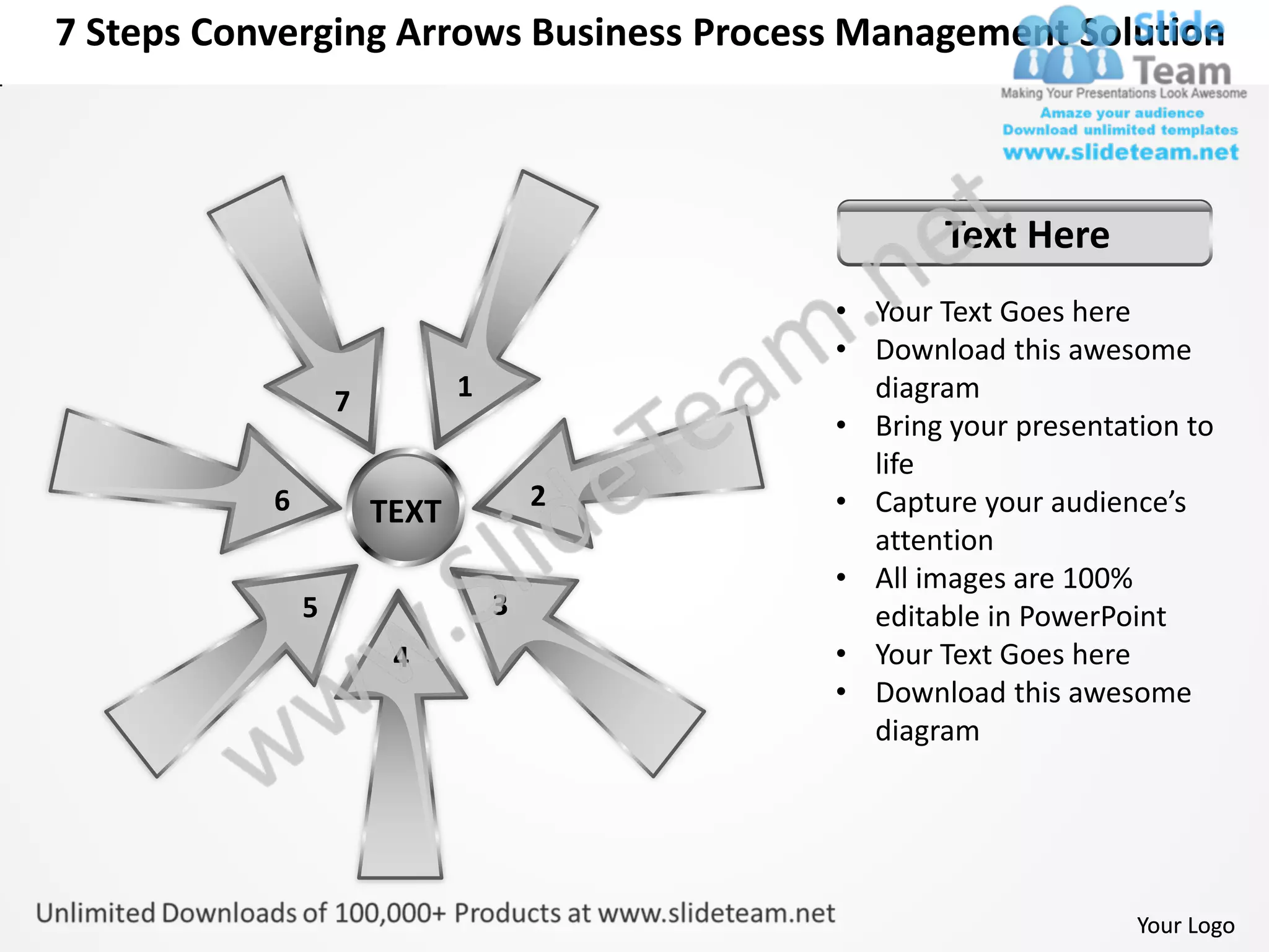 The document describes a 7 step converging arrows business process management solution. It includes 7 steps represented by arrows that converge on a central text box. All images are 100% editable in PowerPoint and allow the user to change color, size, orientation or any icon to their liking. The document also provides instructions on how to ungroup objects and edit their color using theme colors or by selecting fill and solid options.