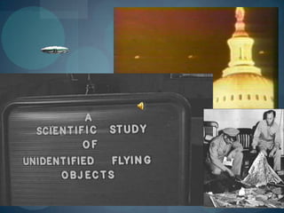 This document provides background information on UFO sightings throughout history. It discusses early sightings in the 1940s and the coining of the term "flying saucer" in 1947. It then outlines several famous UFO sightings and cases from the 1940s to 2000s, including the Roswell incident, Betty and Barney Hill abduction, Phoenix Lights, and Mexican military footage. It also summarizes the conclusions of Project Blue Book that UFOs do not represent a threat or advanced technology beyond our understanding. The document gives an overview of the history of UFO sightings and cases through prominent examples.