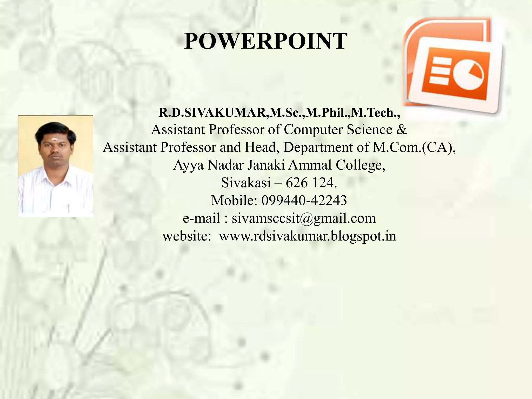 This document provides an overview of PowerPoint, the Microsoft presentation software. It discusses that PowerPoint allows users to create slideshows with text, graphics, videos and other objects. Slides can be printed, displayed live, or navigated through by a presenter. PowerPoint offers animation features like custom animations for on-slide elements, transitions between slides, and moving pictures to tell stories. The PowerPoint Viewer software allows viewing presentations without Microsoft PowerPoint installed.