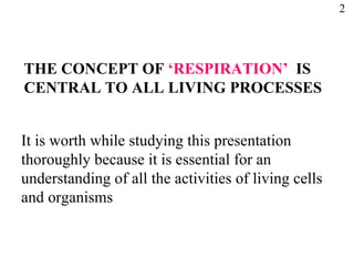 1. Respiration is the process by which living cells produce energy from food sources like glucose.