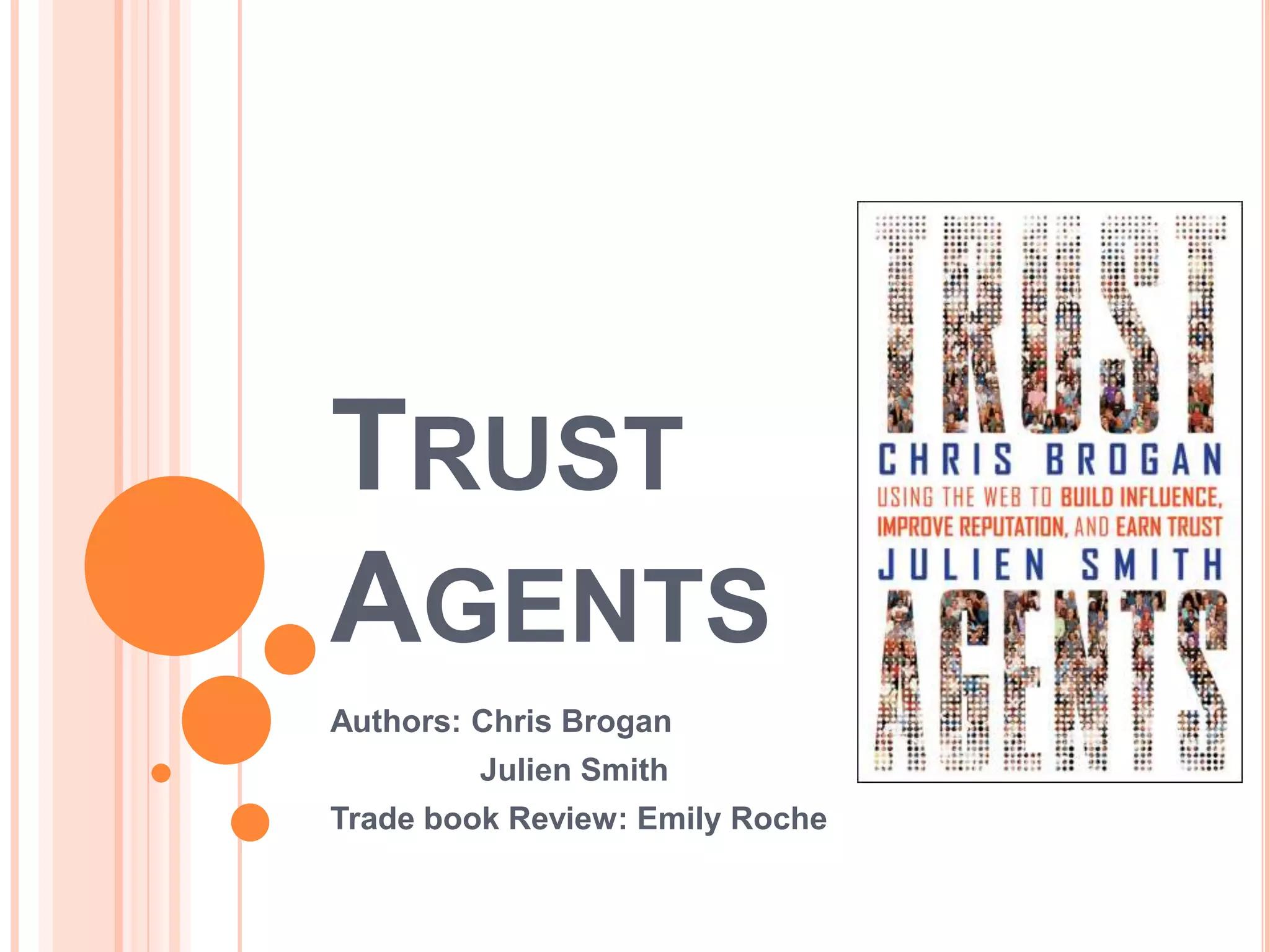 This document summarizes a book on building trust and influence through social media written by Chris Brogan and Julien Smith. It highlights that the book provides important insights on using social media for business and communication beyond just connecting with friends, and leaves the reader with things to think about applying new strategies. Contact information is provided for the book reviewer Emily Roche across social media platforms and email.