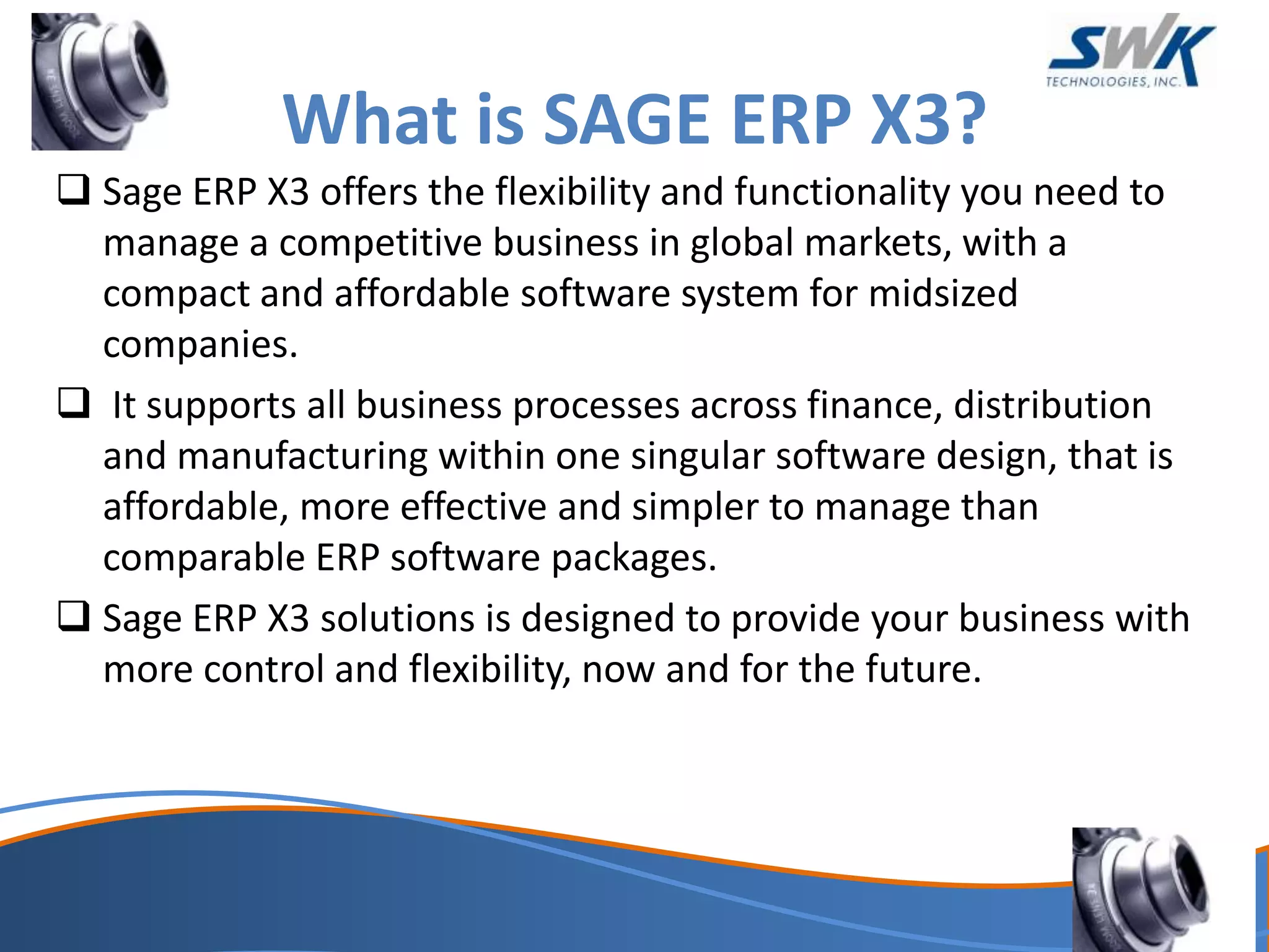 Sage ERP X3 is an ERP software package designed for mid-sized companies that supports all business processes across finance, distribution, and manufacturing within a single system. It provides flexibility and functionality to manage global business operations more effectively and at a lower cost than comparable ERP systems. Sage ERP X3 uses a web-native design to facilitate collaboration and information sharing between employees, partners, suppliers and customers. It offers configurable workflows and reporting to provide real-time visibility and informed decision-making across the business.