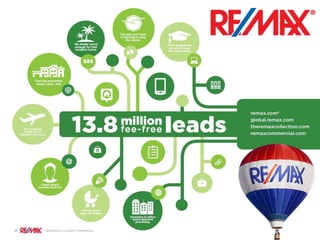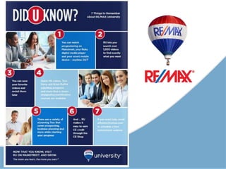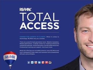 RE/MAX offers agents free customizable websites and mobile apps, a CRM tool for leads and reports, design software for marketing materials, and an online university for training and designations. These digital tools are included as part of the RE/MAX affiliation and help agents build websites, generate leads, and enhance their marketing.