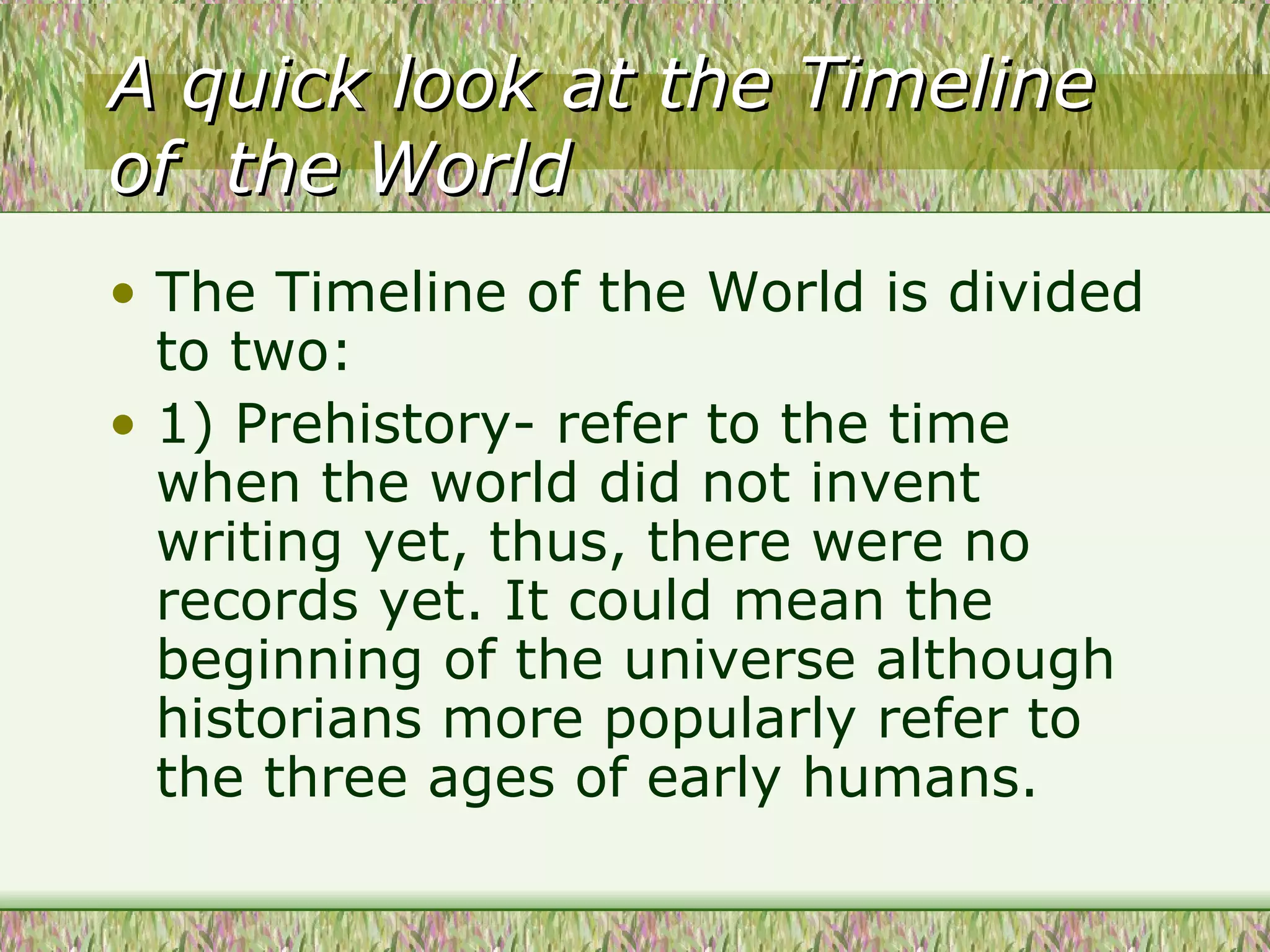The document outlines the timeline of world history from prehistory to modern times. It divides world history into two periods: prehistory, before writing was invented; and history, after writing allowed events to be recorded. Prehistory is further divided into the Stone Age, Bronze Age, and Iron Age. The Stone Age includes the Paleolithic Age (Old Stone Age), Mesolithic Age, and Neolithic Age (New Stone Age). The Paleolithic Age saw early humans' absolute dependence on nature and use of stone tools. Agriculture and animal domestication began in the Neolithic Age.