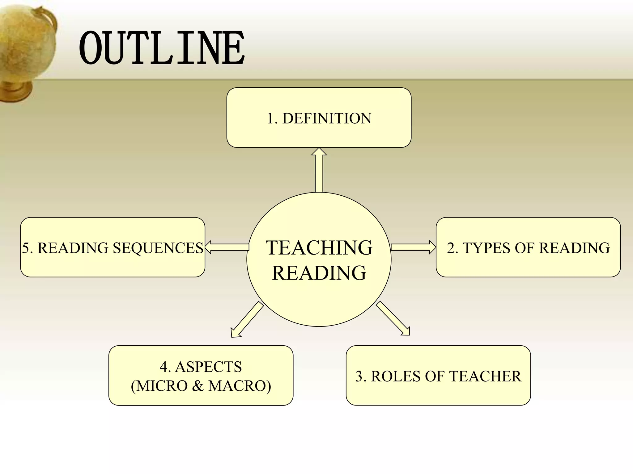 This document discusses teaching reading strategies, including extensive and intensive reading. Extensive reading involves rapidly reading large amounts of material for general understanding, while intensive reading involves reading shorter texts in detail to develop specific skills. The roles of the teacher in each type of reading are also described. Finally, reading sequences are proposed as a strategy that involves multiple language skills, such as speaking, reading, and writing, to give students practice with skills like skimming and scanning.